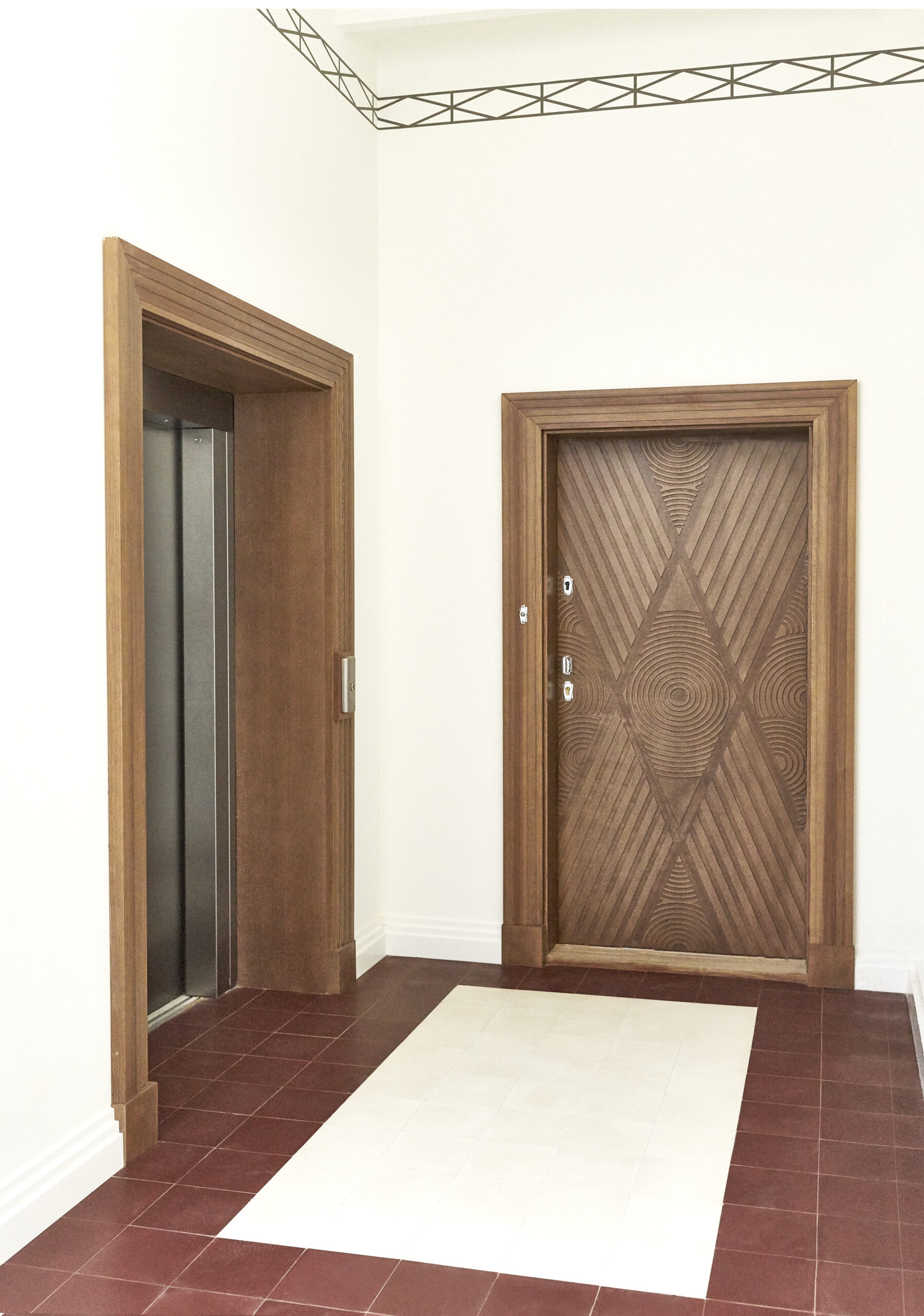 - geometryczne zdobienia drzwi do lokali oraz zdobienia klatek utrzymane w stylu epoki
