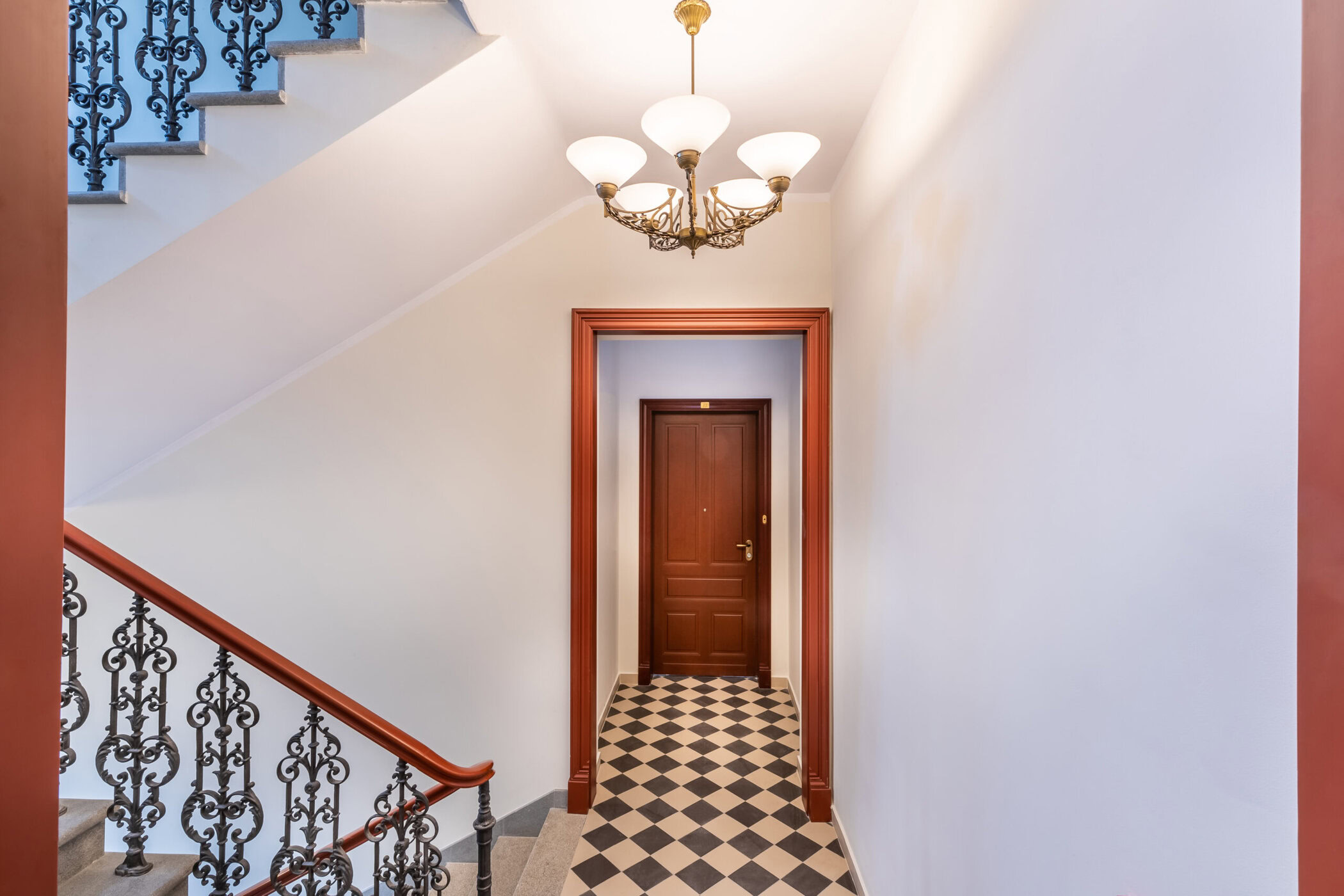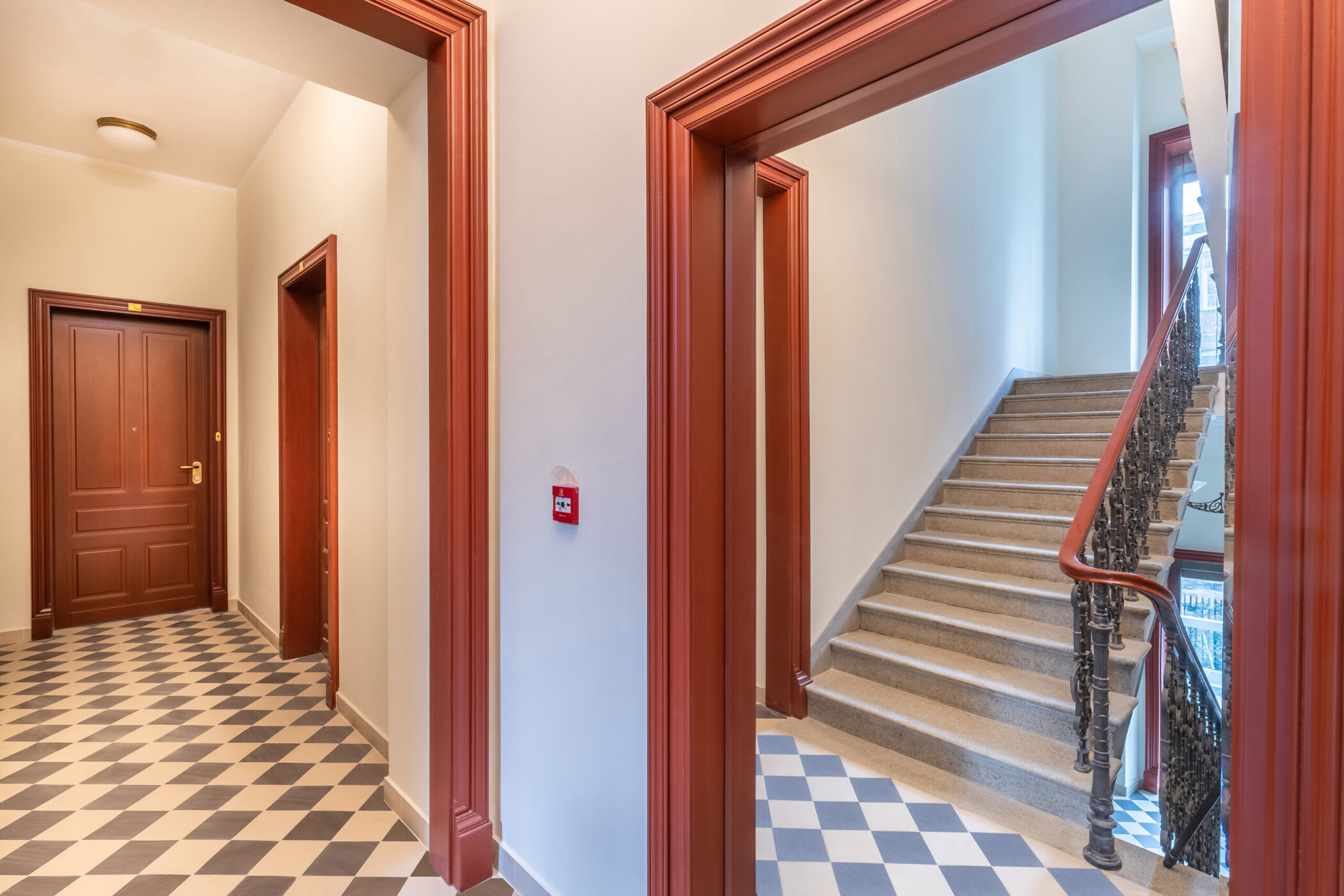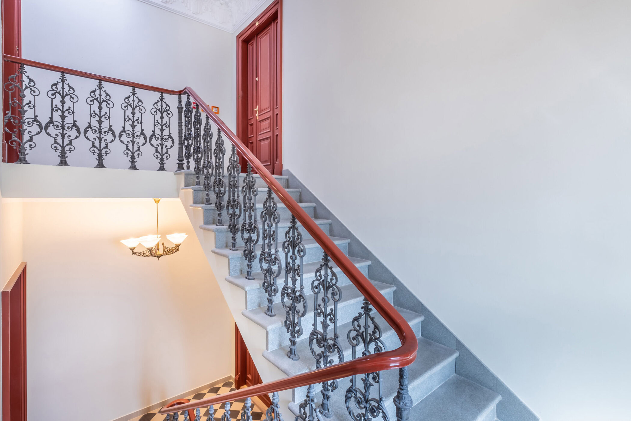 - rzemieślniczo odnowiona sztukateria, elementy drewniane i metalowe w częściach wspólnych