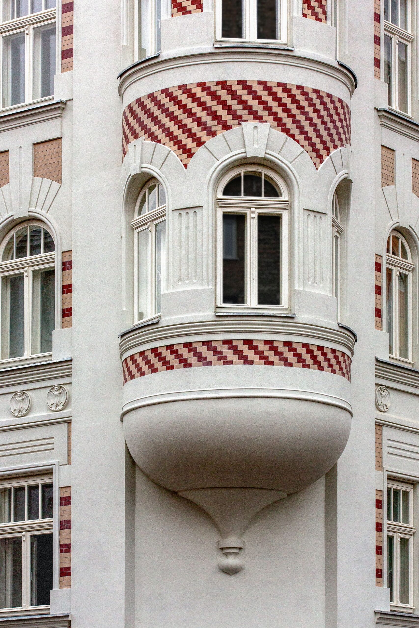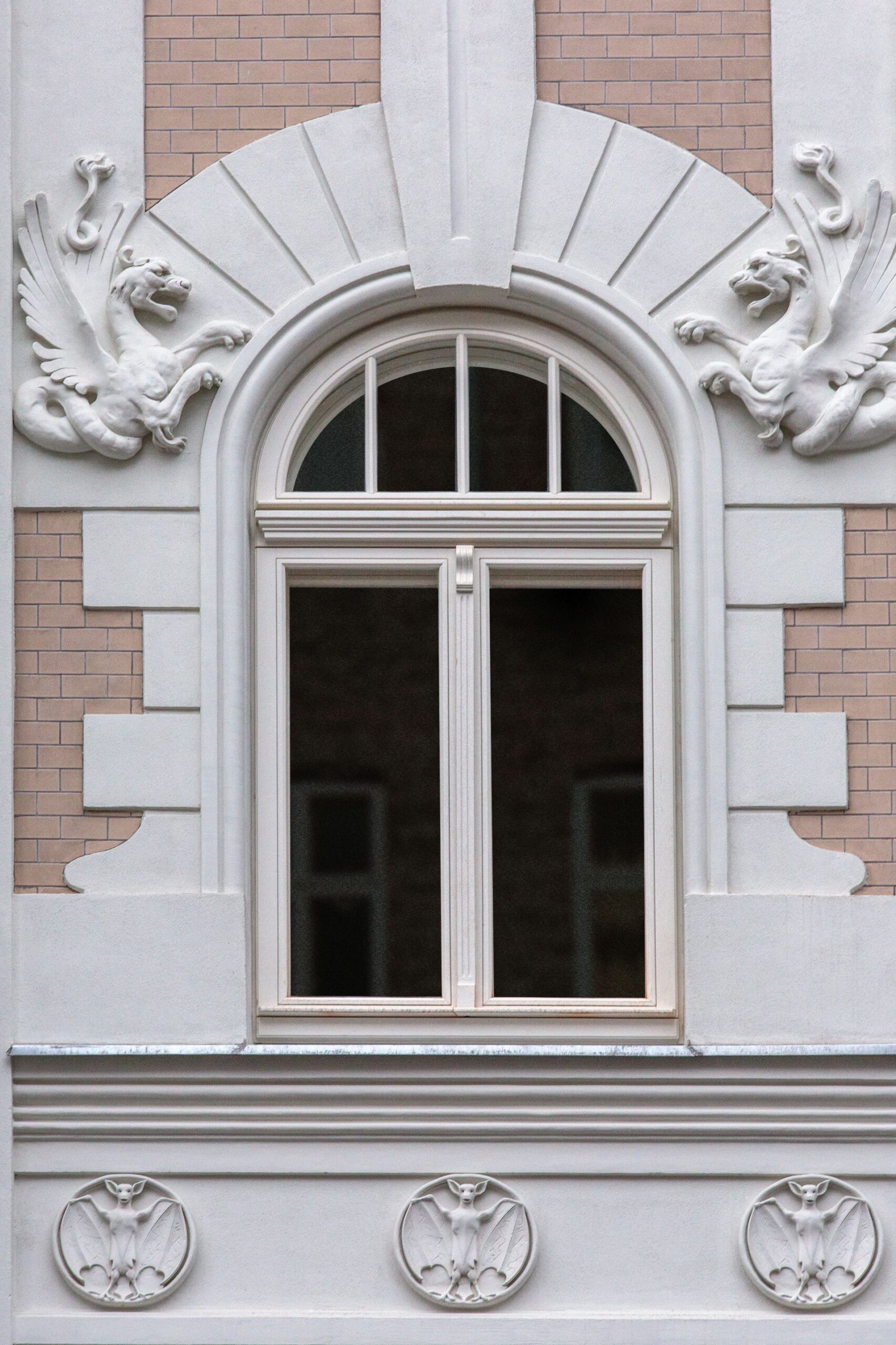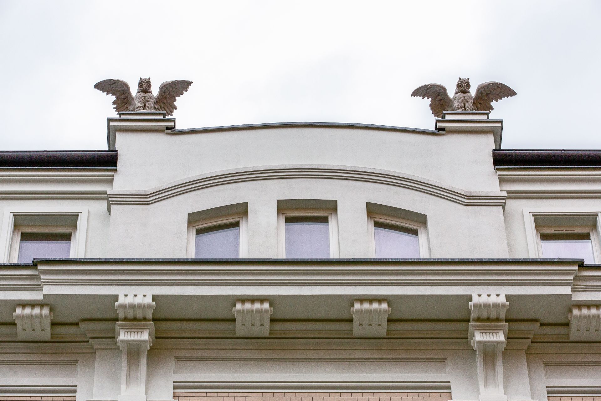 Naroże gmachu zdobi wykusz, zwieńczony kopułą. Na elewacjach, którym z pietyzmem przywrócono dawną świetność, dostrzec można płaskorzeźby nietoperzy i smoków. Na fasadę odrestaurowanej kamienicy powróciły wspaniałe rzeźby sów z rozpostartymi skrzydłami.